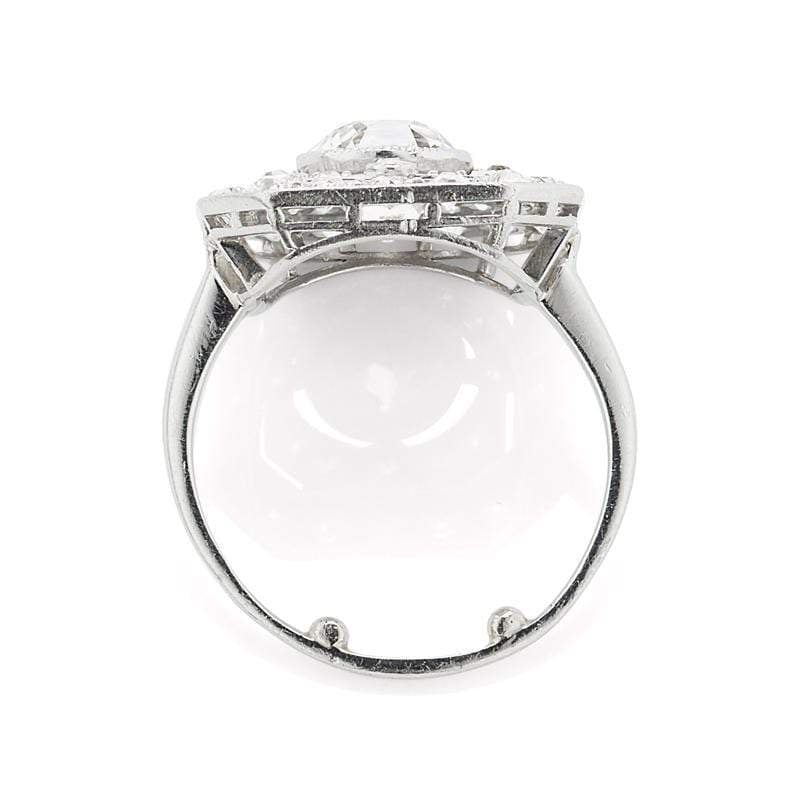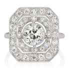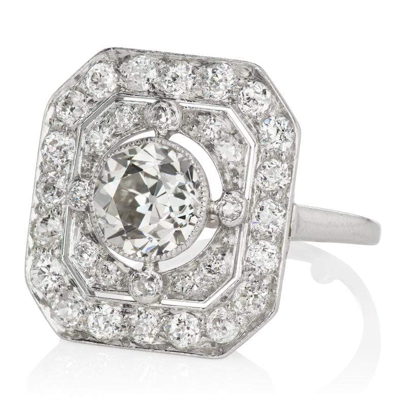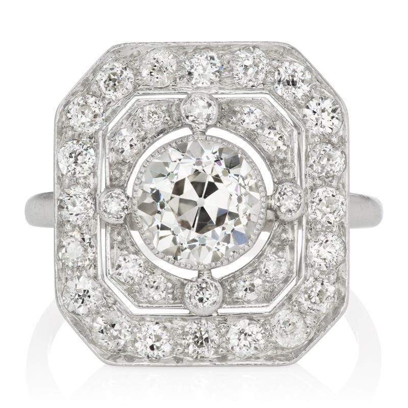 The Debra ring is an authentic vintage ring from the Art Deco Era circa 1920. The ring centers a GIA certified 1.67 Carat Old European Cut diamond of I color, SI1 clarity. The stone is bezel-set in a platinum setting. Thirty-two old European cut diamonds are set into a double halo panel-style ring. The ring is currently size 7 and can be resized!