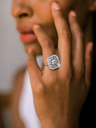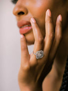 We love these panel-style rings that take up lots of real estate and create a shining, shimmering look. This one in particular features absolutely gorgeous antique diamonds that are so bright and vivid and can be seen from a mile away. The ring is low-profile for an easy wear and makes for the perfect cocktail ring or the coolest engagement ring.