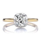 The Allie 0.98 ring is an AB original design. The ring centers a GIA-certified 0.98 carat Old Mine Cut diamond of K color, SI2 clarity. The stone is set in a two-tone platinum collet setting on an 18kt yellow gold band. The ring is currently size 6 and can be resized!