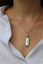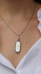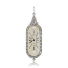 Dorian is a stunning watch pendant designed by Cartier in the Edwardian Era, circa 1910. Featuring a highly desirable elongated watch face with Roman numerals, the pendant reads "Cartier, Paris". The watch pendant features a halo of bead-set rose cut diamonds with a bezel of milgrain detailing around the stones. One Old European Cut diamond of approximately 0.10 carats of H-I color, VS clarity is set atop the pendant. The pendant has a Platinum bail allowing it to slide onto any chain of your choosing.