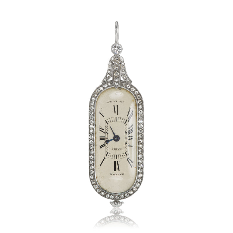 We were thrilled to come across this extremely unique Cartier timepiece! Well over 100 years old, watch pendants like this would have been worn on a necklace or secured elegantly to one's dress. Diamond-clad in true vintage Cartier style, we love her styled as a pendant necklace on a long chain for modern glamour and a surprising conversation piece!