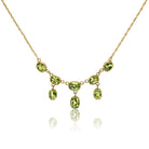 The Nevara necklace is an authentic antique necklace from the Edwardian Era. Seven beautiful peridot stones are collet-set and suspended on a 12-karat gold chain. The necklace is 17.5 inches long.