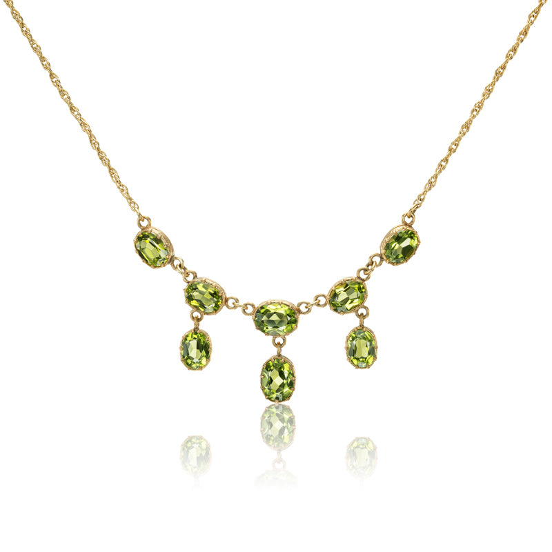 Festoon necklaces like this were popular accessories for ladies of the early 20th century, and we can see why they are still so desirable today! With a beautiful drop on the neck, these brightly saturated peridot stones flash verdant hues of sage and bright lime, and a wonderful pop of color to any look.