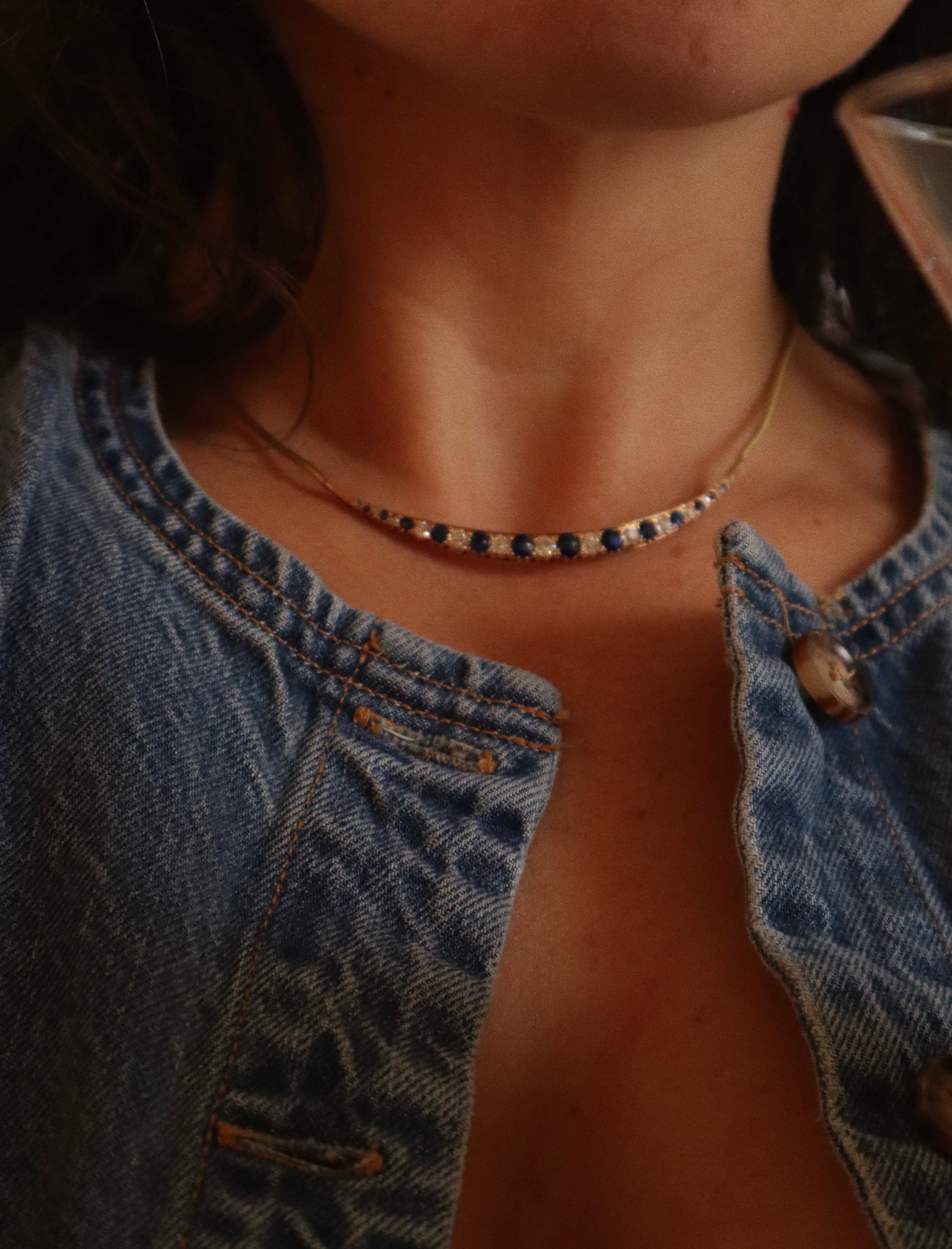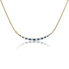 Dark blue sapphires and bright diamonds come together in this piece to create a crescent pendant with tones of a starry night sky. The buttery gold setting and sleek snake chain add even more beauty to this celestial piece with sinuous movement around the neck. A stand alone piece that also plays nicely with layers.
