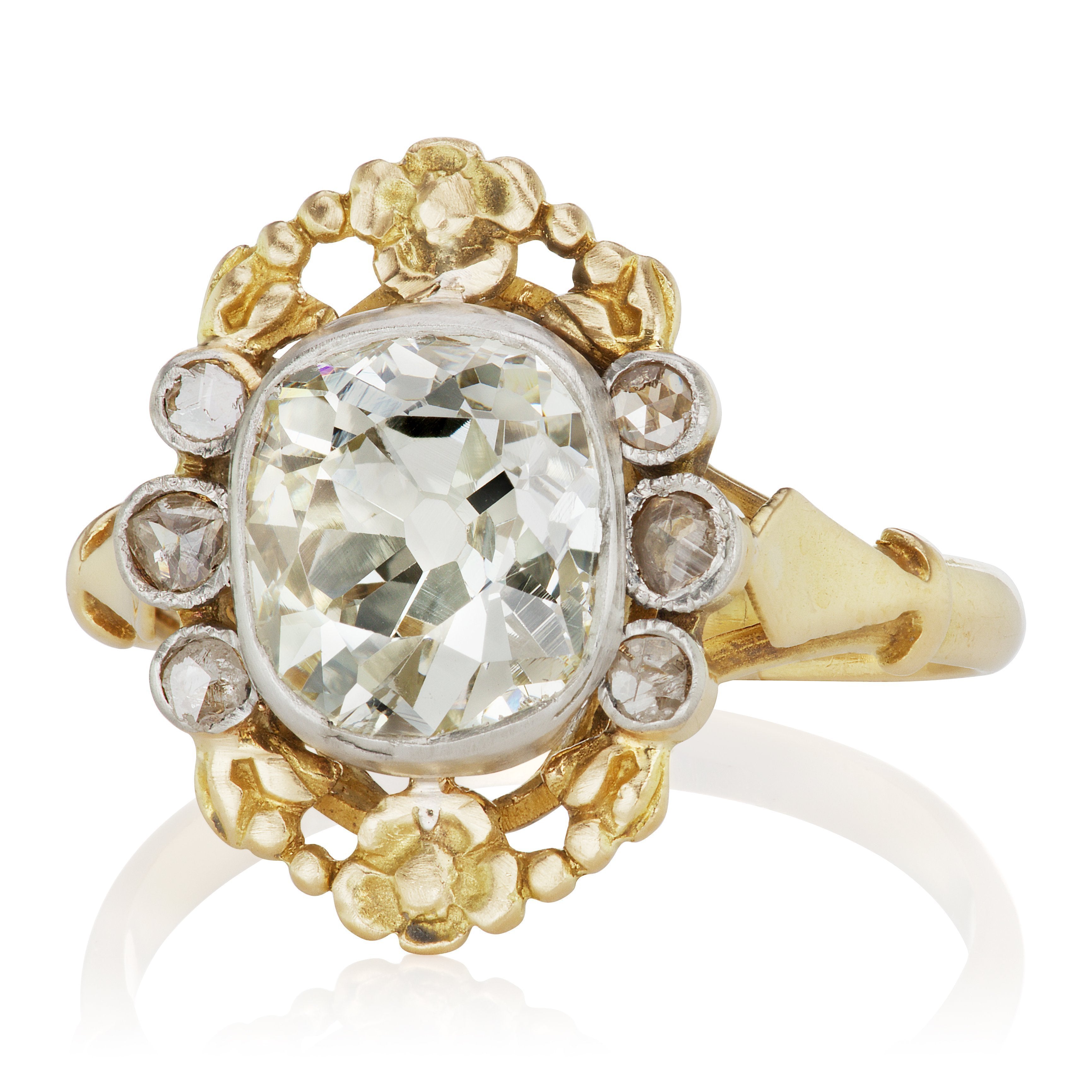 The Marigold ring is an antique Art Nouveau French-made engagement ring circa 1905! The ring centers a 2.14 carat old mine cut diamond of approximately M-N color, VS2 clarity. The diamond is bezel-set in a platinum-topped yellow gold setting. To each side are three bezel-set rose cut diamonds with a wreath-like halo. The ring is currently size 7 and can be resized!