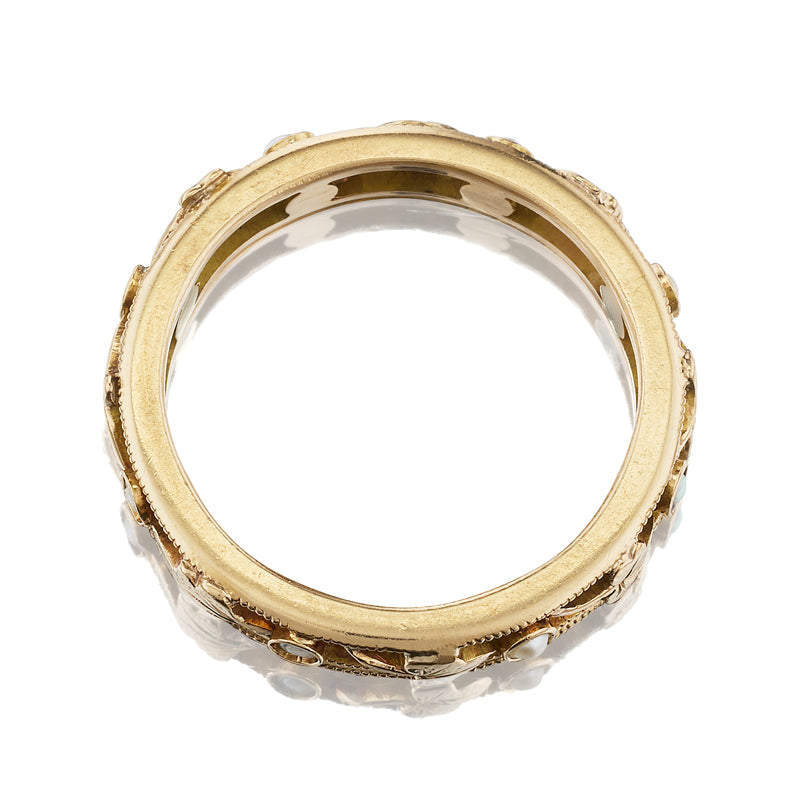 We are enchanted by this earthy and ethereal band with its alternating pearls and leaves. Quintessentially Art Nouveau, this piece is the perfect way to add vintage flair to your stack!