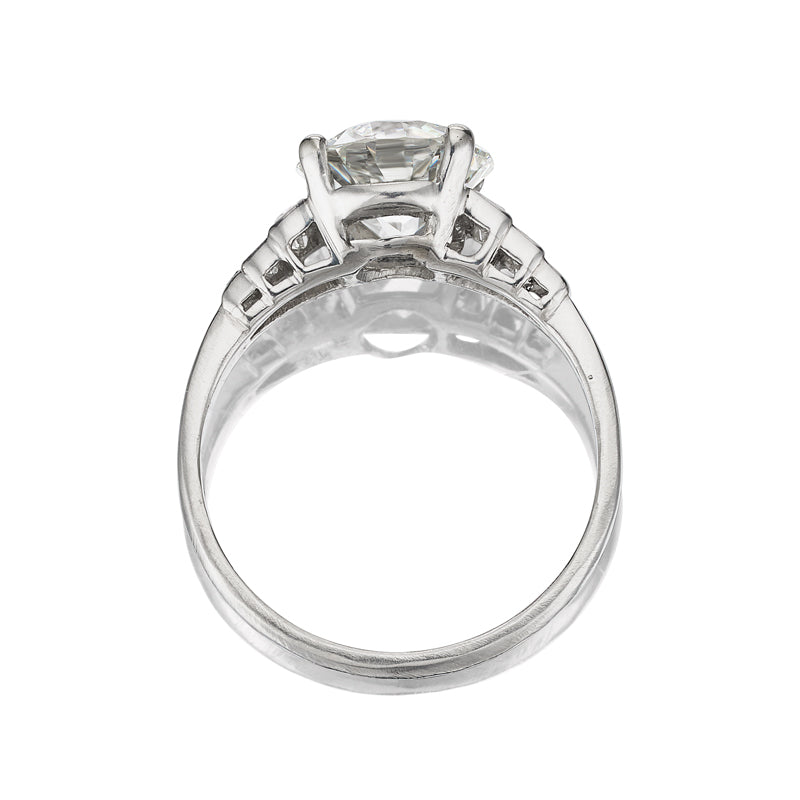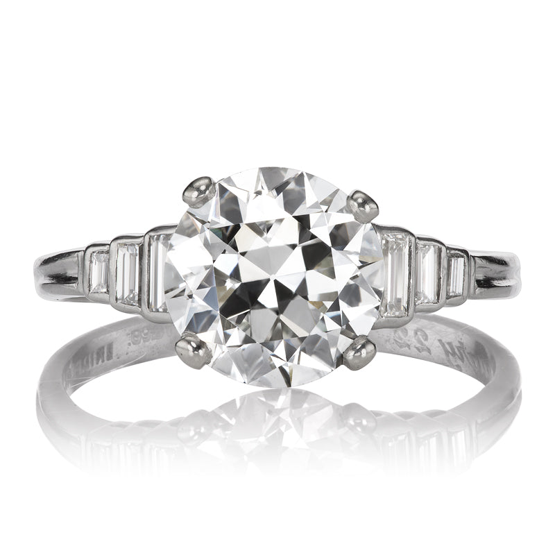 The Lucine ring is an antique Tiffany & Co. ring from the Art Deco era circa 1930. The ring centers a GIA-certified 2.02 carat Transitional Cut diamond of J color, SI1 clarity. The stone is set in a four-prong setting. Three diamond baguettes of graduated sizes are bezel-set to either side of the center stone. The ring is stamped "Tiffany &. Co" on the interior of the band. The ring is currently size 5.25 and can be resized!