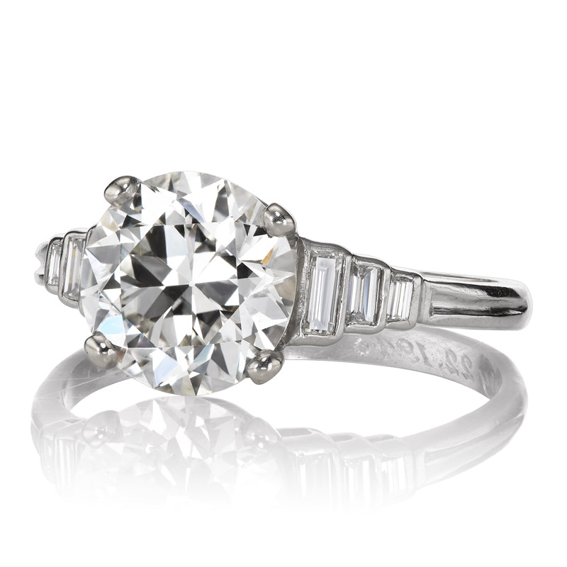 A stunning example of early 20th-century Tiffany & Co. design featuring a very bright Transitional Cut diamond with lots of fiery, checkerboard faceting. We love the bold step-down baguettes to either side of the stone, which remind of us a glittering Jazz Age staircase. A timeless piece of jewelry to cherish.