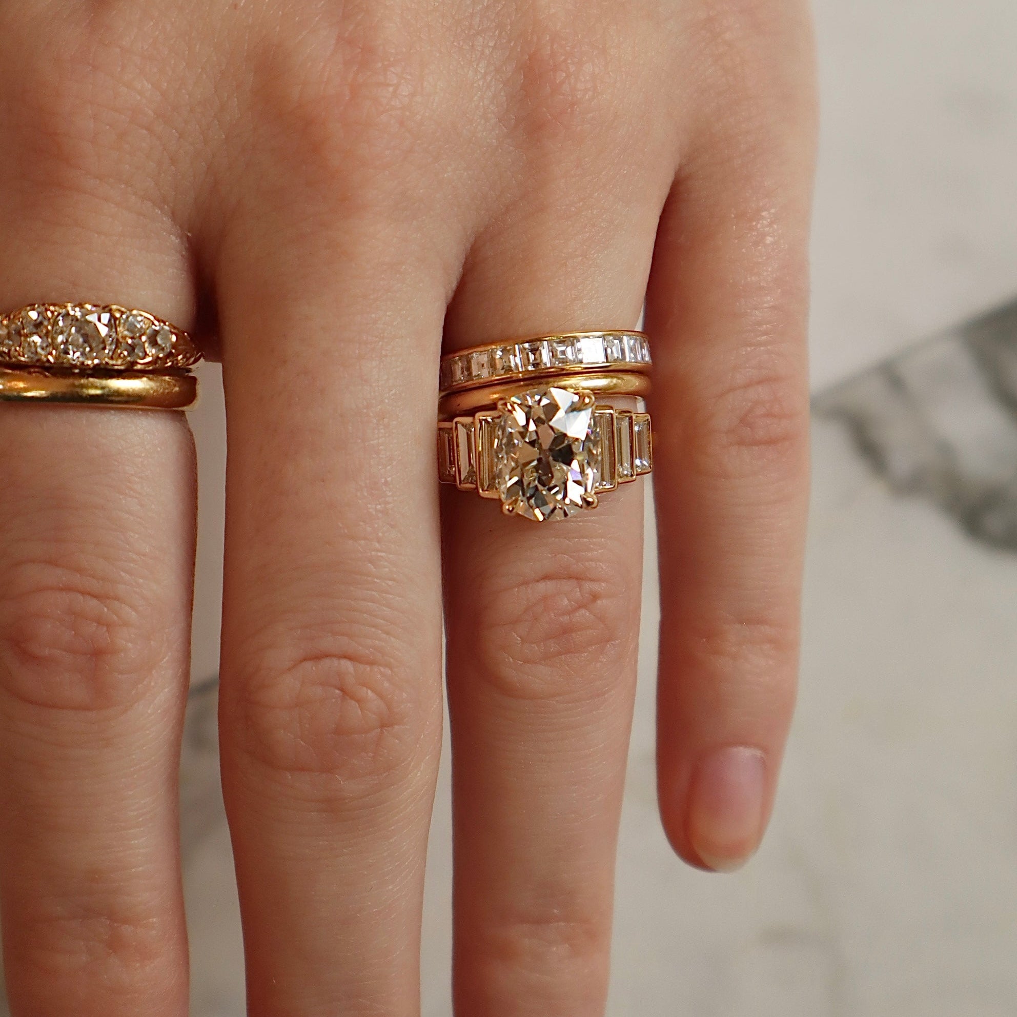 The Camille 3.52 ring is an AB original design. The ring centers a GIA-certified 3.52-carat Old Mine Cut diamond of J color, SI1 clarity. The stone is set in a 4-prong setting of our signature 18kt yellow gold with three vertical baguettes bezel-set to each side of the center stone. The ring is currently size 5.75 and can be resized!
