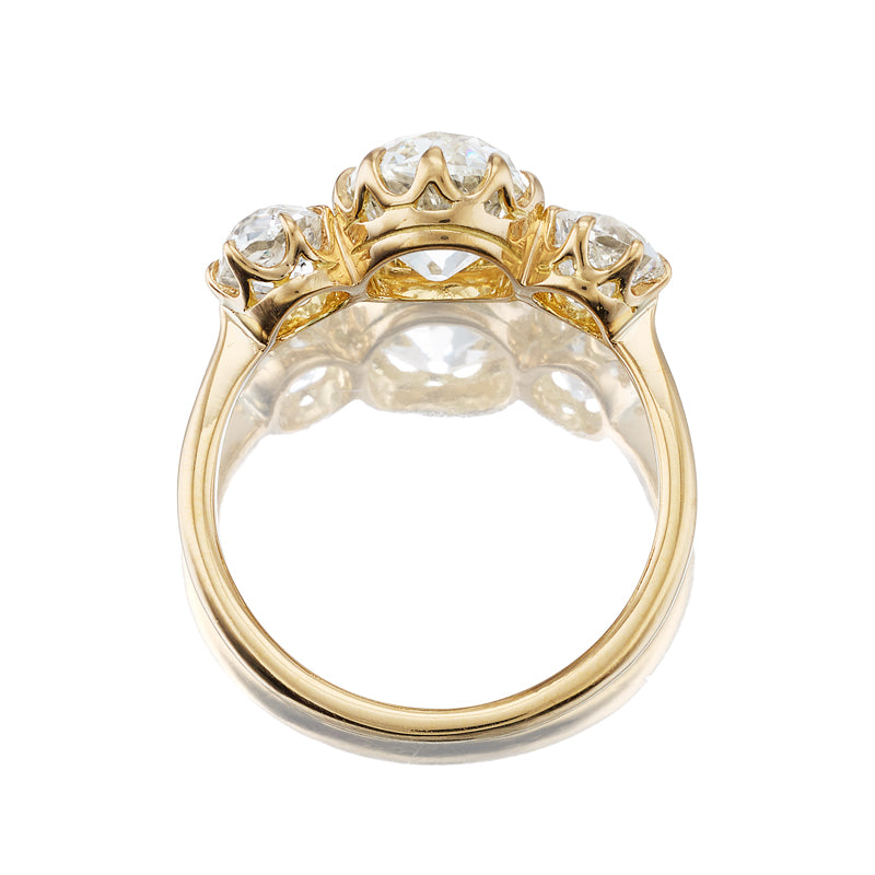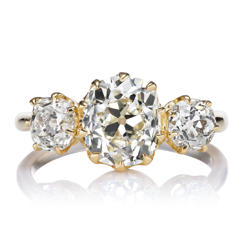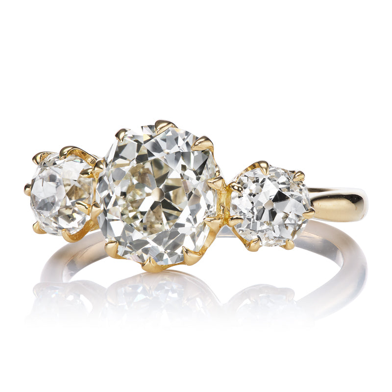The Marielle ring is an AB original design. The ring centers a GIA-certified 2.18 carat Old Mine Cut diamond of K color, VS1 clarity. To each side of the center stone is an Old Mine Cut diamond of coordinating color and clarity, both combining for a total of 1.06 carats. The three stones are set in an 18kt yellow gold prong setting. The ring is currently size 5.75 and can be resized!