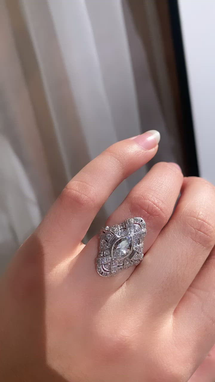The Carmel Ring is an Art Deco ring circa 1920! This ring centers a GIA-certified 1.09-carat marquise diamond of H color, SI1 clarity. The diamond is bezel-set in a platinum setting that is decorated with intricate metal work and an additional 44 round diamonds and two vertical baguettes that all combine for approximately 0.60 carats. The ring is size 5 and and can be resized to some sizes!
