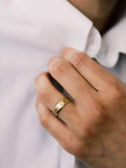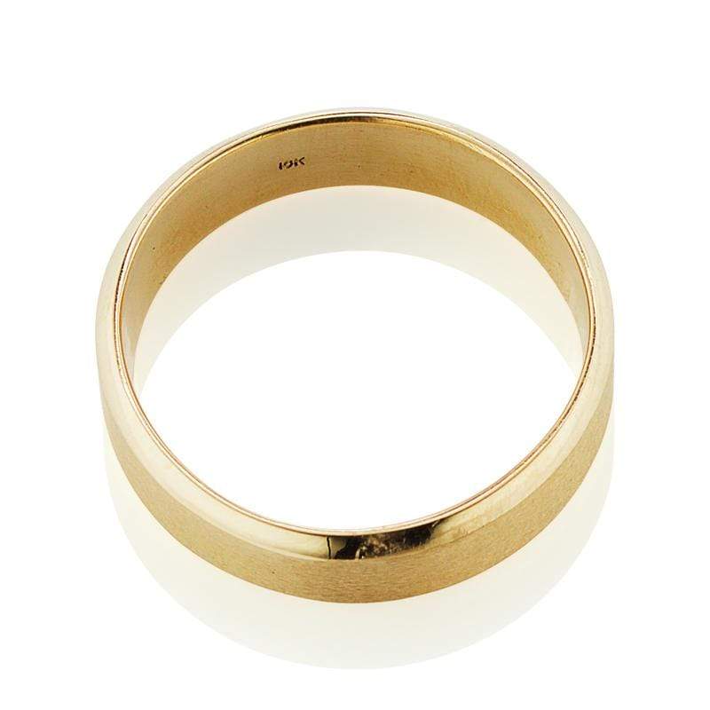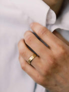 The Darren band is a AB made Men's wedding band. This Flat Men's Wedding Band is approximately 5.8mm wide, 1.4mm thick, and designed to sit flat to the finger for a super comfortable fit! It is made in the perfect hue of 18kt yellow gold (made to match the AB-made engagement rings and bands) and finished with an antique polish in the center and angled polished edges.