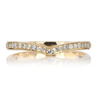 The Diamond V Half Hoop Band is a vintage-inspired AB made diamond and gold wedding band. This band has small bead-set diamonds of approximately H-I color, VS clarity that wrap about three-quarters of the way around the band. The band is approximately 2 mm wide. This ring can be made in 18kt yellow gold or platinum.