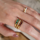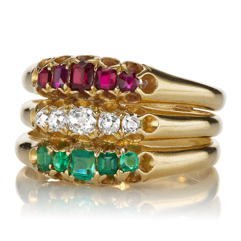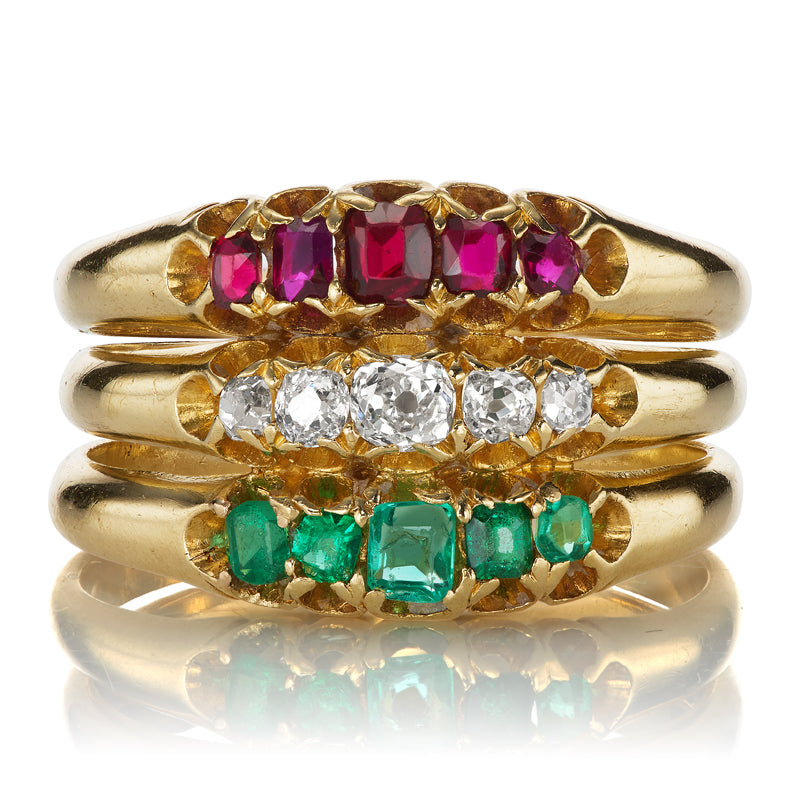 The Gilian ring is an authentic vintage diamond ring from the Victorian Era, circa 1870. The unique ring features 3 rows of antique stones. One Old Mine Cut diamond is set East-West in the center of the ring. Two old cut diamonds are set on each side of the center diamond.  Five ruby stones create the top row of the ring. The bottom row of the ring features five glowing emeralds. The stones are all set in an 18kt Yellow Gold low-profile prong setting. The ring is currently size 6.75 and can be resized!
