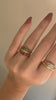 Three rows of antique stones create the most dreamy coverage across this finger in this historic beauty. The lacy gold setting adds detail to the fifteen stones. The Gillian ring lies beautifully on the finger and can be worn alone or stacked with another gold band for a more bold and gold chunky look.