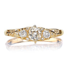 The Thelma ring is an authentic antique diamond ring from the Victorian Era circa 1890. The ring centers an Old Mine Cut diamond of approximately 0.45 carats of M-N color, SI clarity. To each side of the center stone is a smaller Old Cut diamond of approximately J-K color and VS-SI clarity and six tiny rose cut diamonds, all totaling approximately 0.12 carats. The diamonds are set in a beautiful 18k gold ornate scroll-motif setting. The ring is currently size 7 and can be resized!