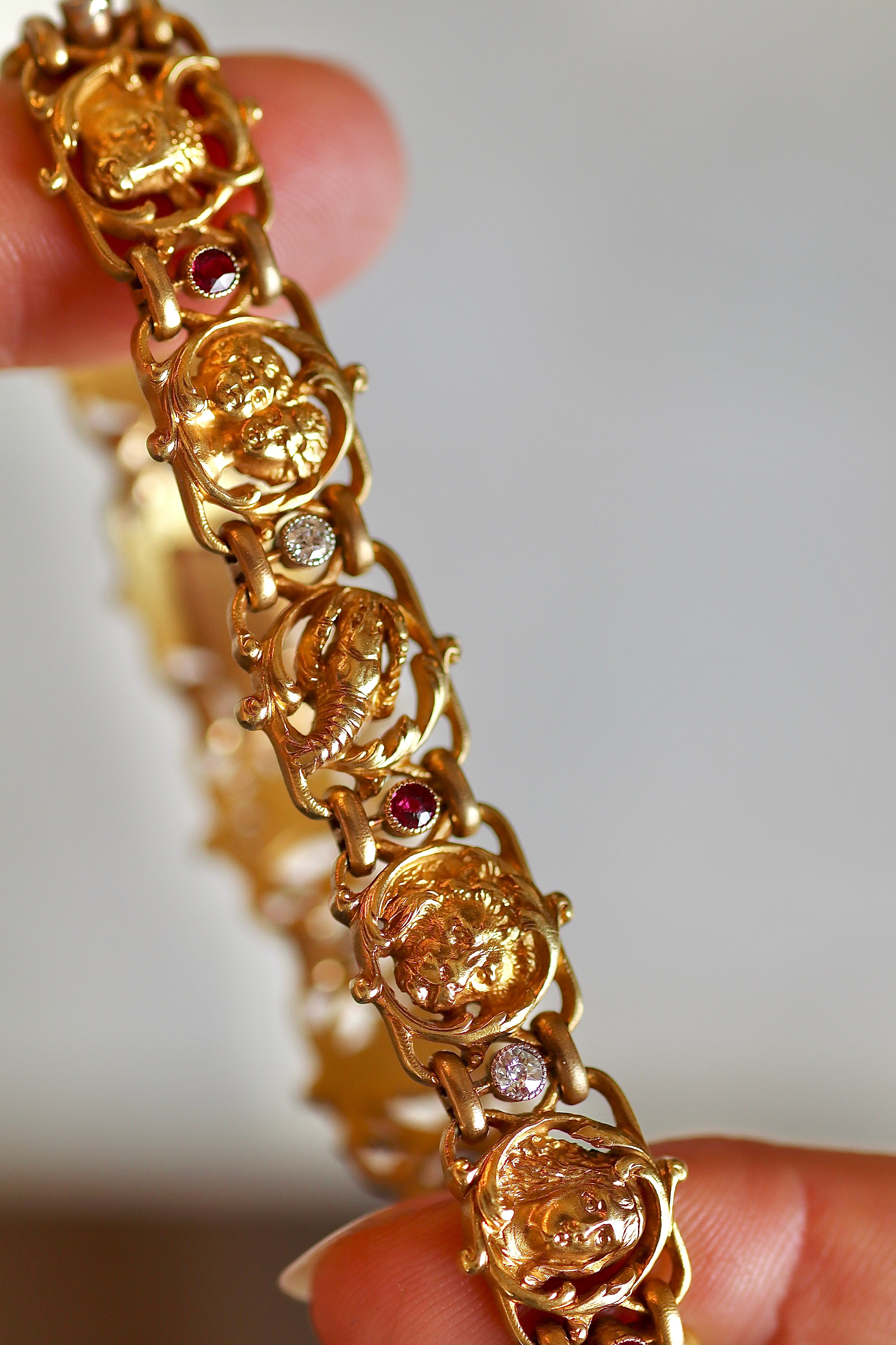 This historic treasure is a true one-of-a-kind piece. We can't get over the immaculate detail of each of the twelve Zodiac signs sculpted and carved in gorgeous high-carat gold. Each sign is a tiny piece of art in itself. Adding an even more special element, six rubies and six diamonds nestle between each sign- one of the rubies even acts as a the bracelet's beautiful clasp! Fated for the stargazer among us 💫