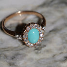 A true treasure with the sweetest personality. The dreamy robin’s egg blue turquoise is framed by a twinkling halo of Old European Cut diamonds that catch the light so beautifully. We adore her low, easy silhouette and the whimsical charm she brings — a ring that feels both lighthearted and storied all at once.