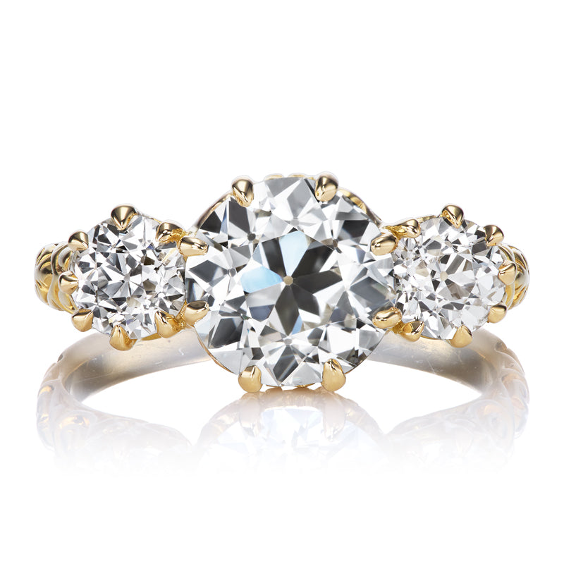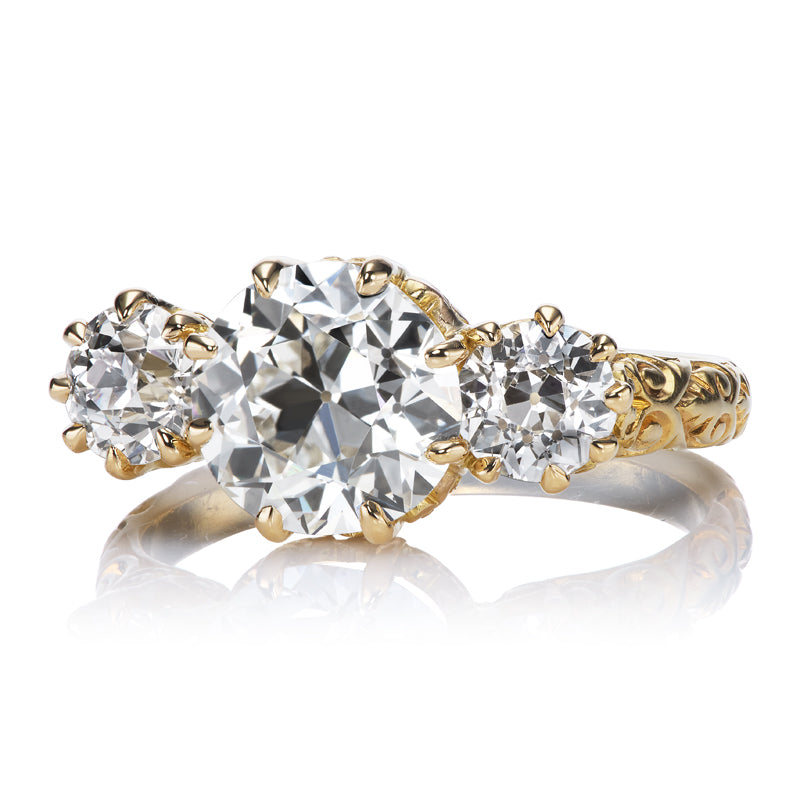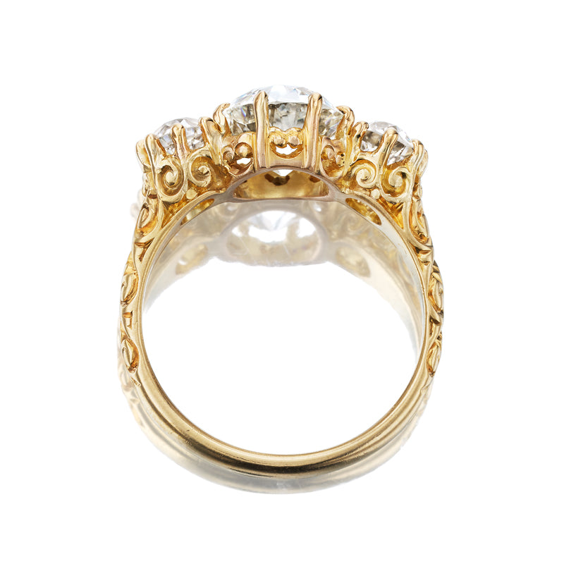 The details! Vibrant, white OECS are encased in beautiful gold that has been engraved with scrolling metalwork. Fleur-de-lys prongs hold the diamonds in a beautiful span across the finger.