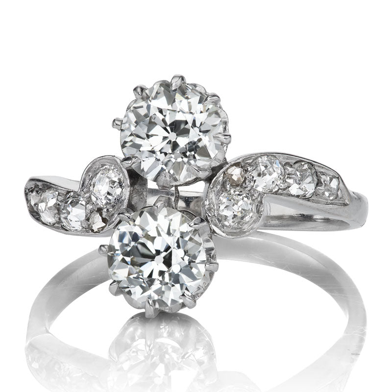 The Haven ring is an authentic vintage diamond Toi et Moi ring from the Edwardian Era circa 1915. The ring features a GIA-certified 0.80-carat Old European Cut diamond of J color, SI2 clarity paired with a GIA-certified 0.68-carat Old European Cut diamond of K color, VS2 clarity. The stones are set in an 8-prong platinum setting with four additional Old European Cut diamonds set on each shoulder. The ring is currently size 5.75 and can be resized!