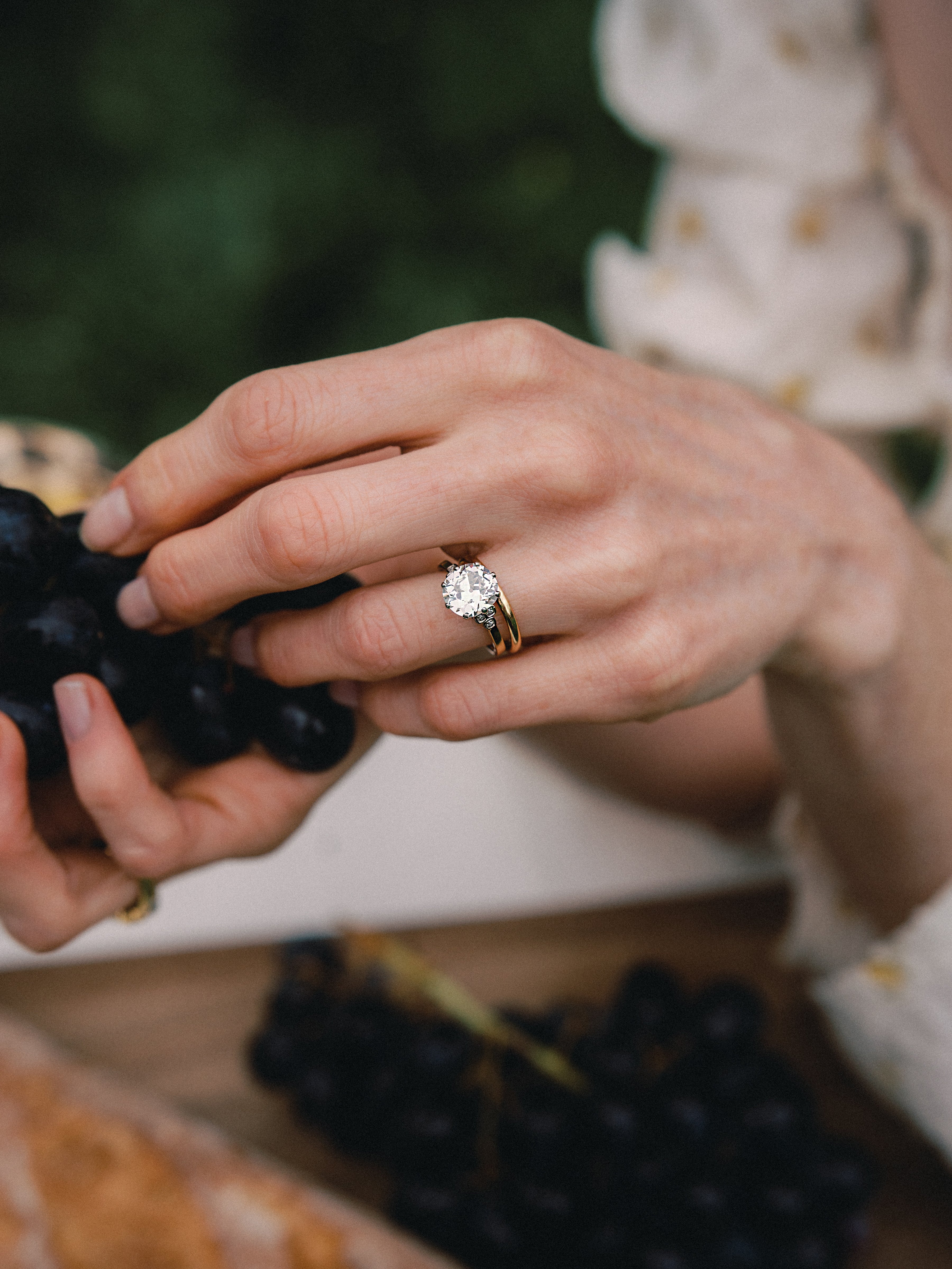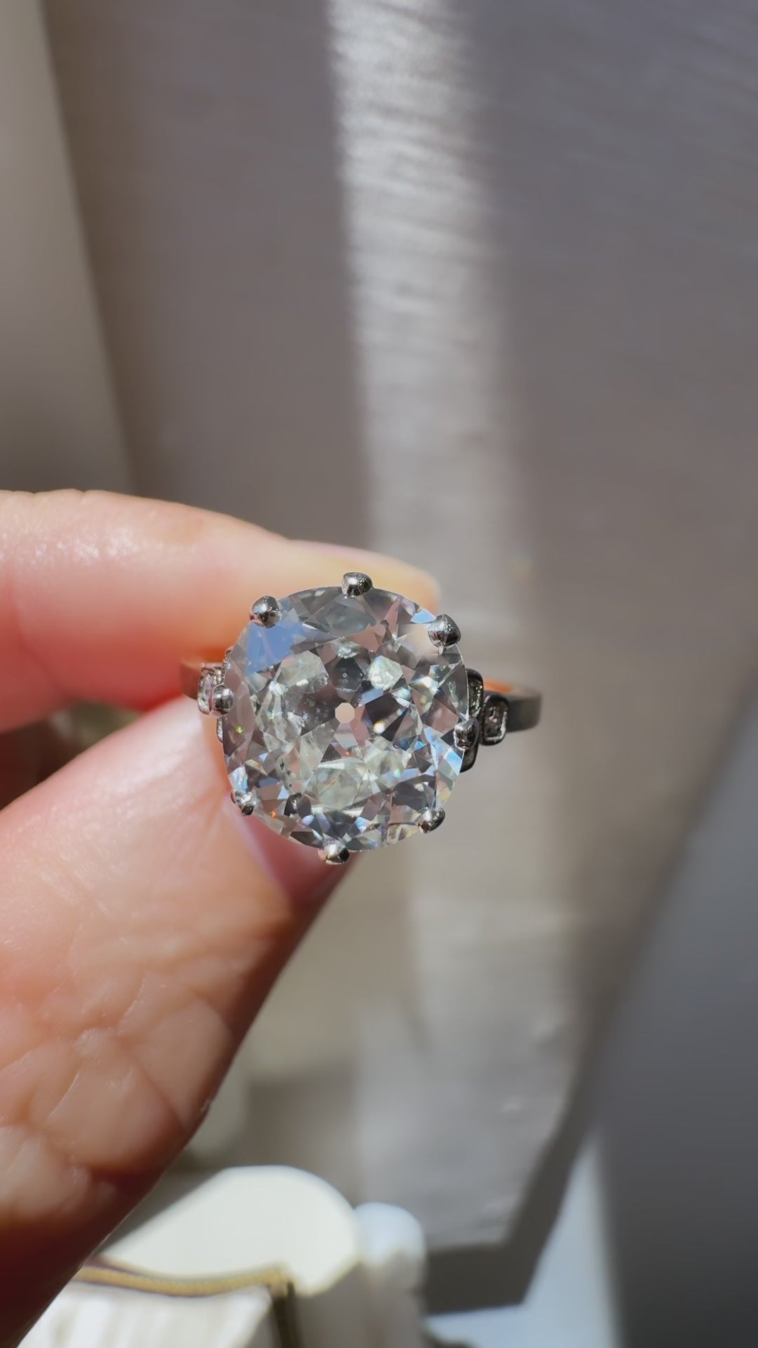 The Siobhan 2.91 ring is an AB original made right here in NYC. The ring centers a GIA-certified 2.91-carat Old Mine Cut diamond of J color, SI1 clarity. The stone is set in an eight-prong platinum and 18kt yellow gold setting with three small Old Cut diamonds on each shoulder. The ring is currently size 6 and can be resized!