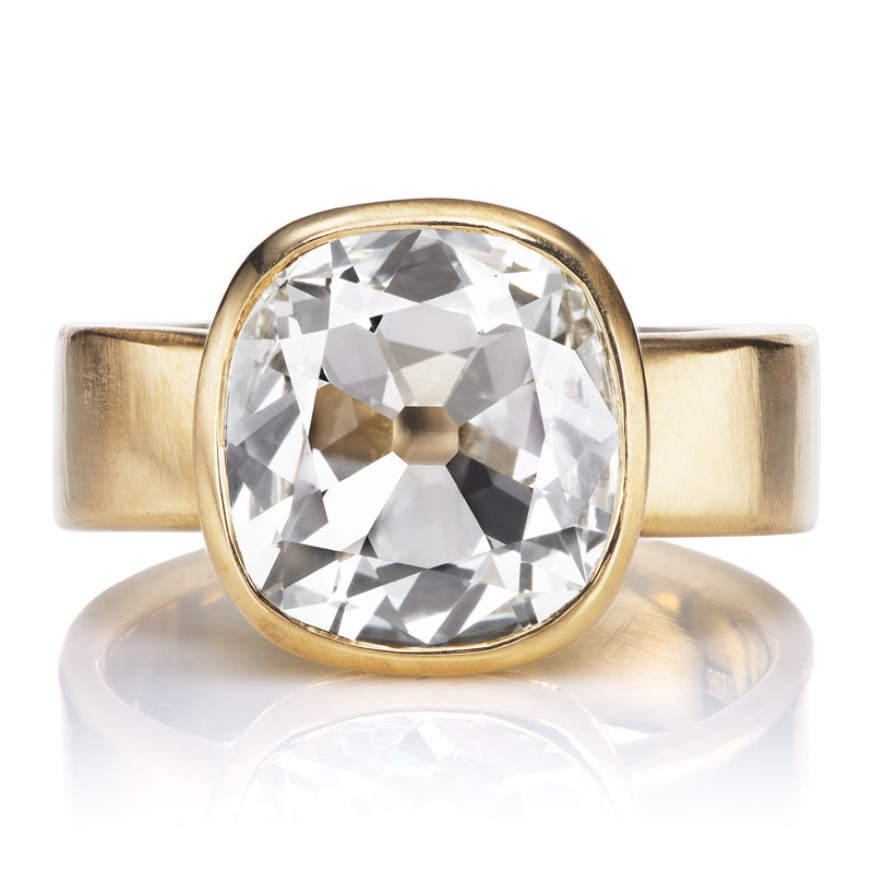 The Naomi 3.01 ring is an AB original design made right here in NYC. The ring centers a GIA-certified 3.01 carat Antique Style Cushion Cut diamond of K color, VS1 clarity. The stone is set in an 18kt Yellow Gold bezel setting. The ring is currently size 6 and can be resized!