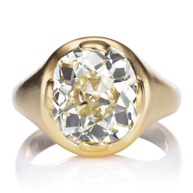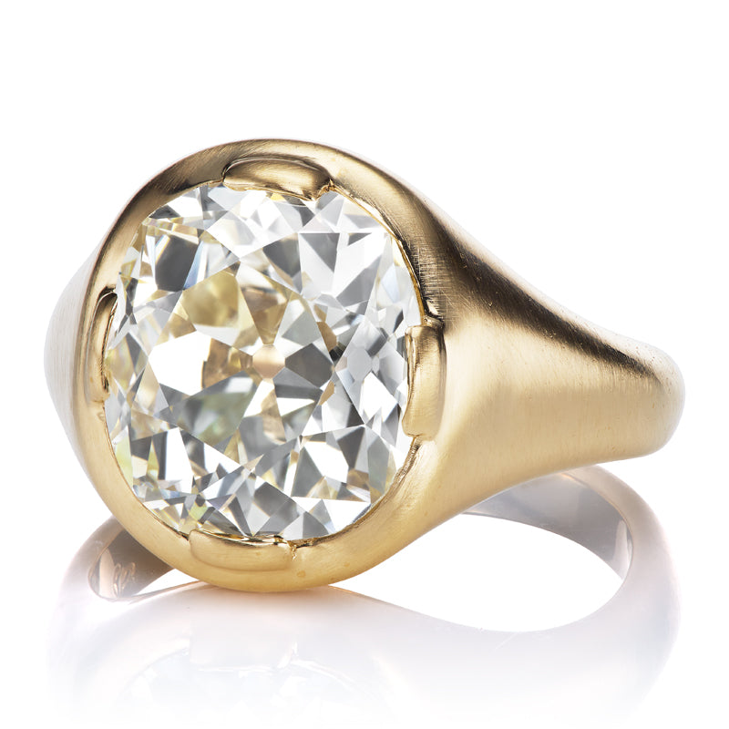 The Gadot 4.80 ring is an AB original design made right here in NYC. The ring centers a GIA-certified 4.80 carat Old Mine Cut diamond of U-V color, SI1 clarity. The stone is set in a 4-prong 18kt Yellow Gold cigar-band style setting. The ring is currently size 6 and can be resized!
