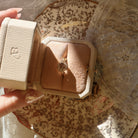 The Velaris 1.87 ring is an AB original design made right here in NYC. The ring centers a GIA-certified 1.87-carat Transitional cut diamond of Fancy Orange-Brown color (read: a delightful Champagne hue), SI2 clarity. The stone is set in a 4-prong 18kt Yellow Gold setting with a halo of calibré cut, Carré cut halo. The ring is currently size 6.25 and can be resized!