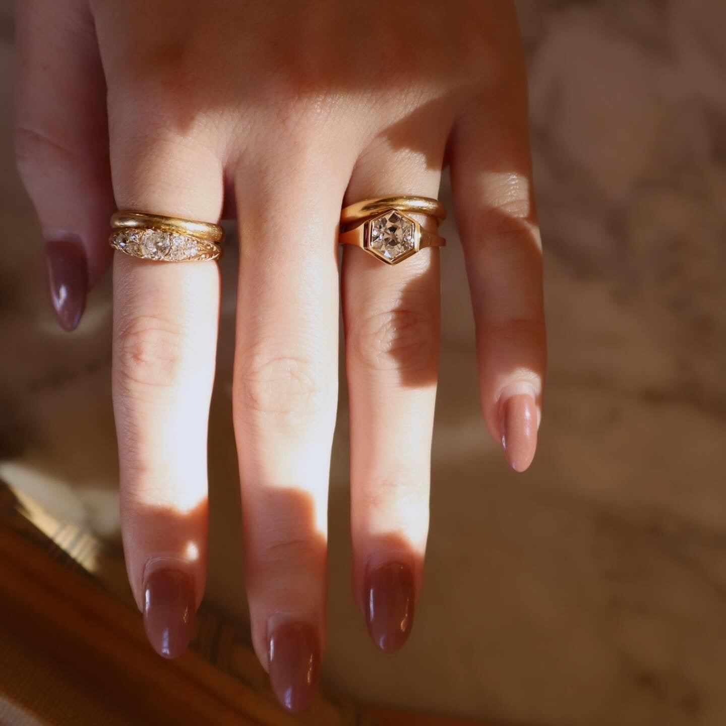 The Veronica 1.46 ring is an AB original design made right here in NYC. The ring centers a GIA-certified 1.46-carat hexagonal cut diamond of H color, SI2 clarity. The stone is bezel set in an 18kt yellow gold setting. The ring is currently size 6 and can be resized!