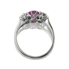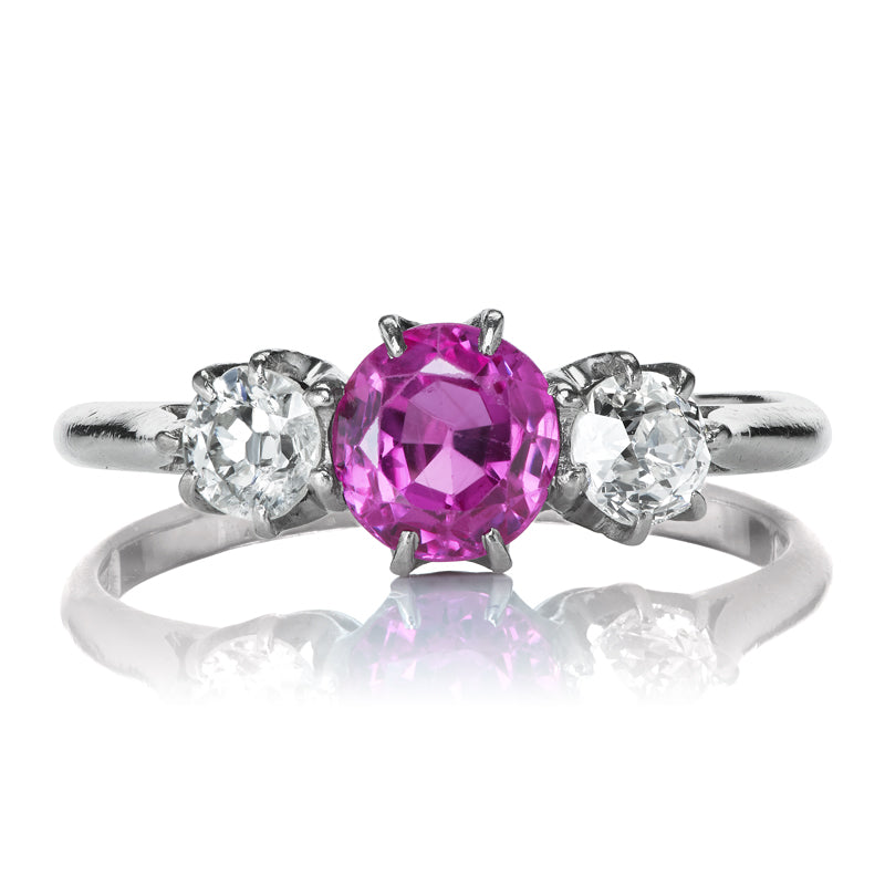 Loving the magenta hue of this sapphire! Such a vibrant and glowy stone, and nestled between two bright white stones no less. A perfect addition to the gemstone lover's collection.