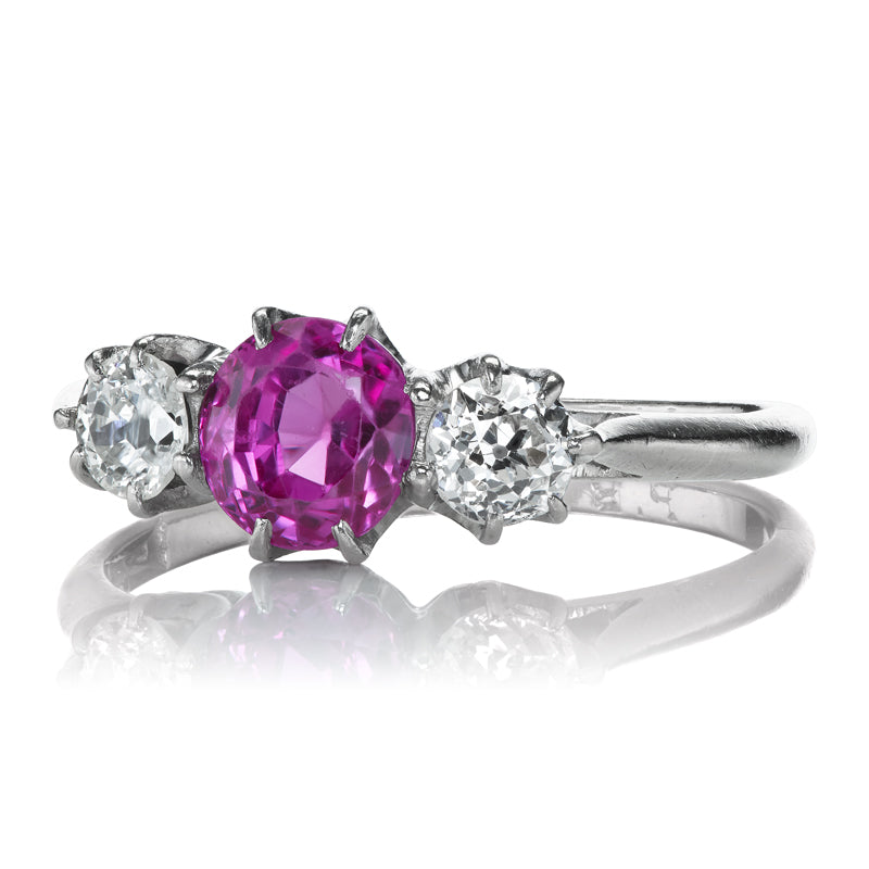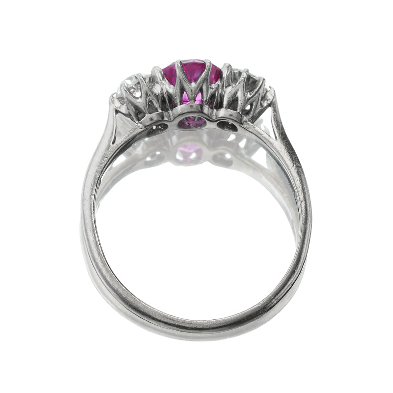 Burmese Purplish Pink Sapphire and Diamond Three Stone Ring