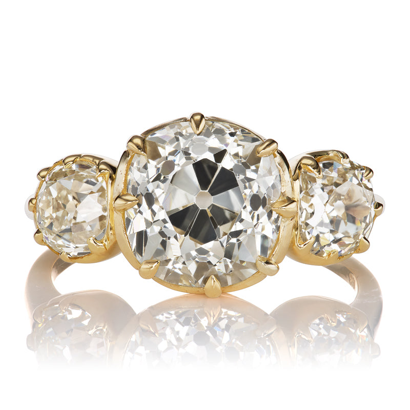 The Florian 3.51 ring is an AB original design made right here in NYC. The ring centers a GIA-certified 3.51-carat Old Mine Cut diamond of M color, VS2 clarity. On either side of the center stone is another Old Mine Cut, both combining for 1.45 carats of approximately M color, VS-SI clarity. The stones are collet-set in our signature 18kt yellow gold. The ring is currently size 6.5 and can be resized!