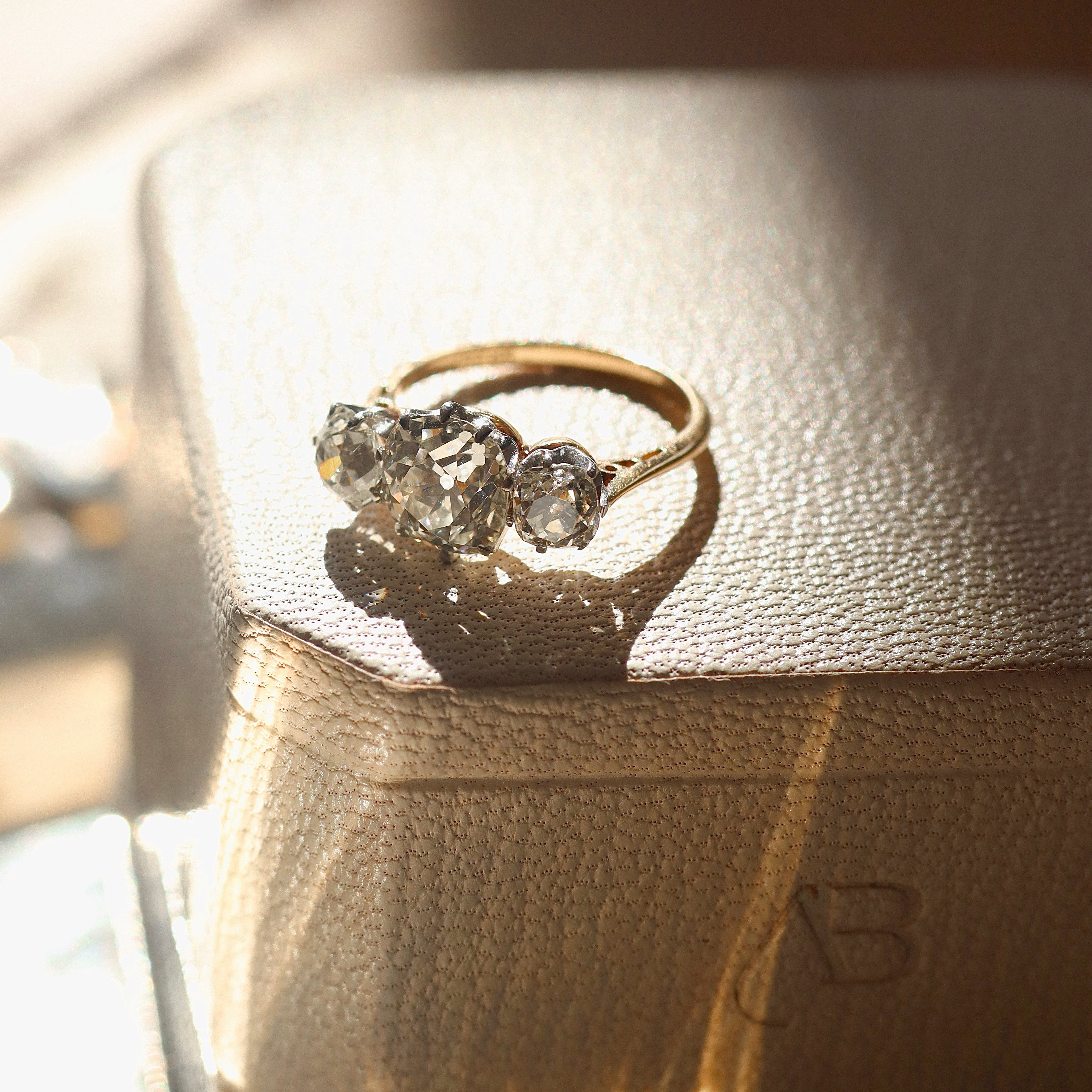 Antique Three Stone Old Mine Cut Diamond Ring in Two-Tone Setting