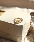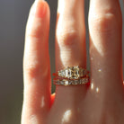 This sweet emerald-cut diamond steals the show with its crisp, clean sparkle. It’s framed by six vertical baguette side stones that add the prettiest touch of balance and give the ring that chic, Art Deco-inspired feel. The low-profile design sits nicely and close to the finger, making it incredibly comfortable for everyday wear. An easy, vintage-inspired beauty you’ll never want to take off! The Art Deco–inspired design We love this ring with our Sawyer Band.