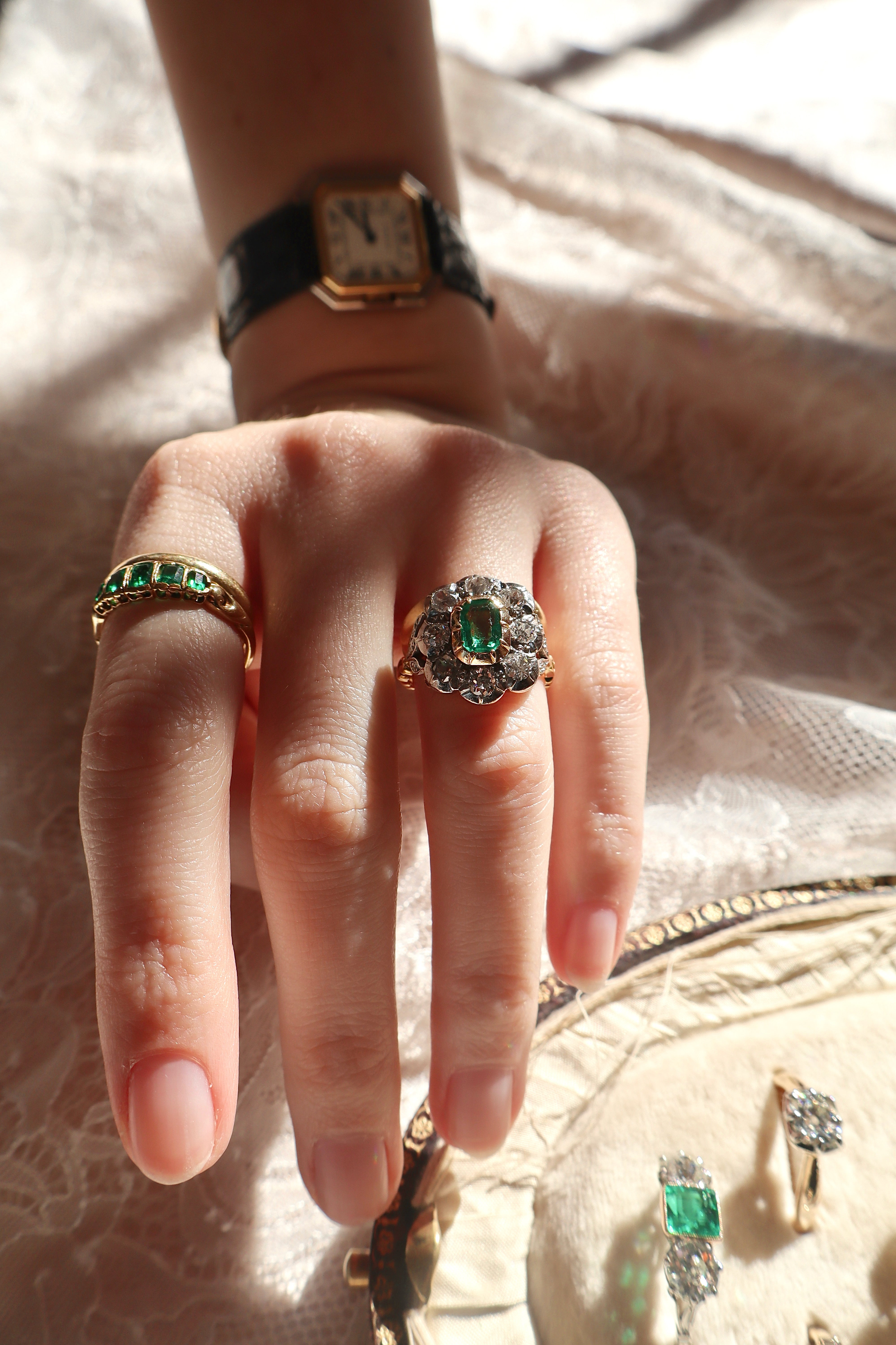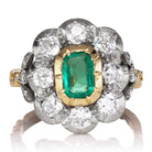 A true treasure from the 1800s, showcasing the romance and artistry of the Georgian era. A glowing Colombian emerald is set at the center of a beautiful collet setting, surrounded by a chunky, bright halo of old cut diamonds. Three petite diamonds accent each shoulder, while intricate swirling engravings trail along the band — details that reflect the remarkable craftsmanship of its time.