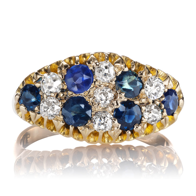 The Maelys ring is an authentic antique diamond ring from the Georgian era circa 1809. The ring features six sapphires totaling approximately 1.20 total carats. Between the sapphires are seven Old Mine Cut diamonds of approximately H-I color and VS-SI clarity, totaling approximately 0.56 carats. The stones are set in an 18kt yellow setting. The ring is currently size 6.75 and can be resized!