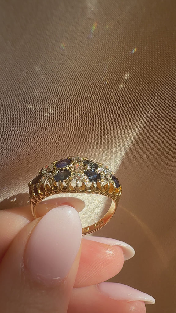 The Maelys ring combines lusciously colored sapphires and bright Old Mine Cut diamonds to create a glistening cobblestone effect in its buttery yellow gold setting. With a fun, finger-hugging shape, she is beautiful worn on any finger.