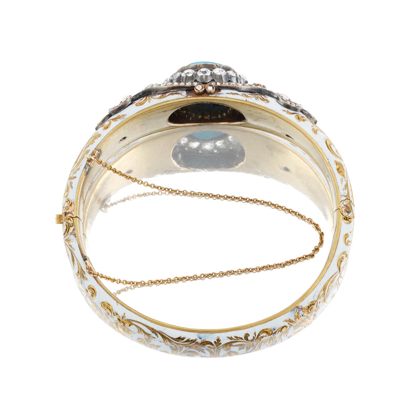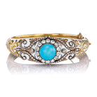 An intricate and rare piece of history, the Beaumont bracelet is an artful interpretation of Victorian trends. In the 19th century, Queen Victoria popularized the use of turquoise in jewelry after gifting her ladies-in-waiting rings surrounded with turquoise cabochons. Enamel-use in jewelry was also resurrected in the Victorian period after long being out-of-fashion. This bangle combines quintessential 19th century design elements with gorgeous Old Mine Cut and Rose Cut diamonds to create an incredibly unique and dramatic bracelet fit for a modern queen. A one-of-a-kind historic treasure and homage to the Victorian era.