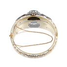 The Beaumont bracelet is an authentic antique bracelet from the Victorian Era, circa 1860. The ring centers a cabochon-cut turquoise on an 18kt Yellow gold bangle. The turquoise is surrounded by a halo of 15 Old Mine Cut diamonds with two additional Old Mine Cut diamonds set next to the center cluster. An additional 94 rose-cut diamonds are bead-set in a swirling pattern around the face of the bangle. All of the diamonds combine for approximately 2.70 carats of I-J-K color, VS-SI. The bangle is painted with white enamel and intricately detailed gold scrolling patterns. The stones are all set in a two-tone 18kt yellow gold and silver bangle setting. The bangle measures 7.5 inches.