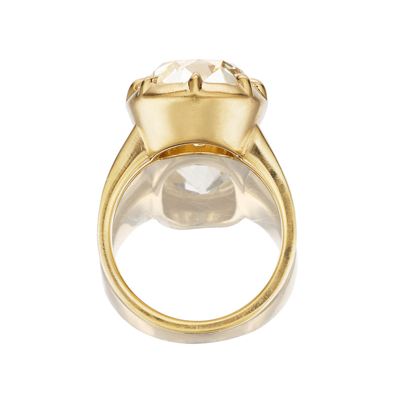 This ring combines some of our favorite things--a huge and juicy true antique elongated Old Mine Cut diamond in a warmer tone, a Georgian-inspired collet setting, with a flowing band. All these elements come together for gilded beauty that is high on style and packs serious impact.
