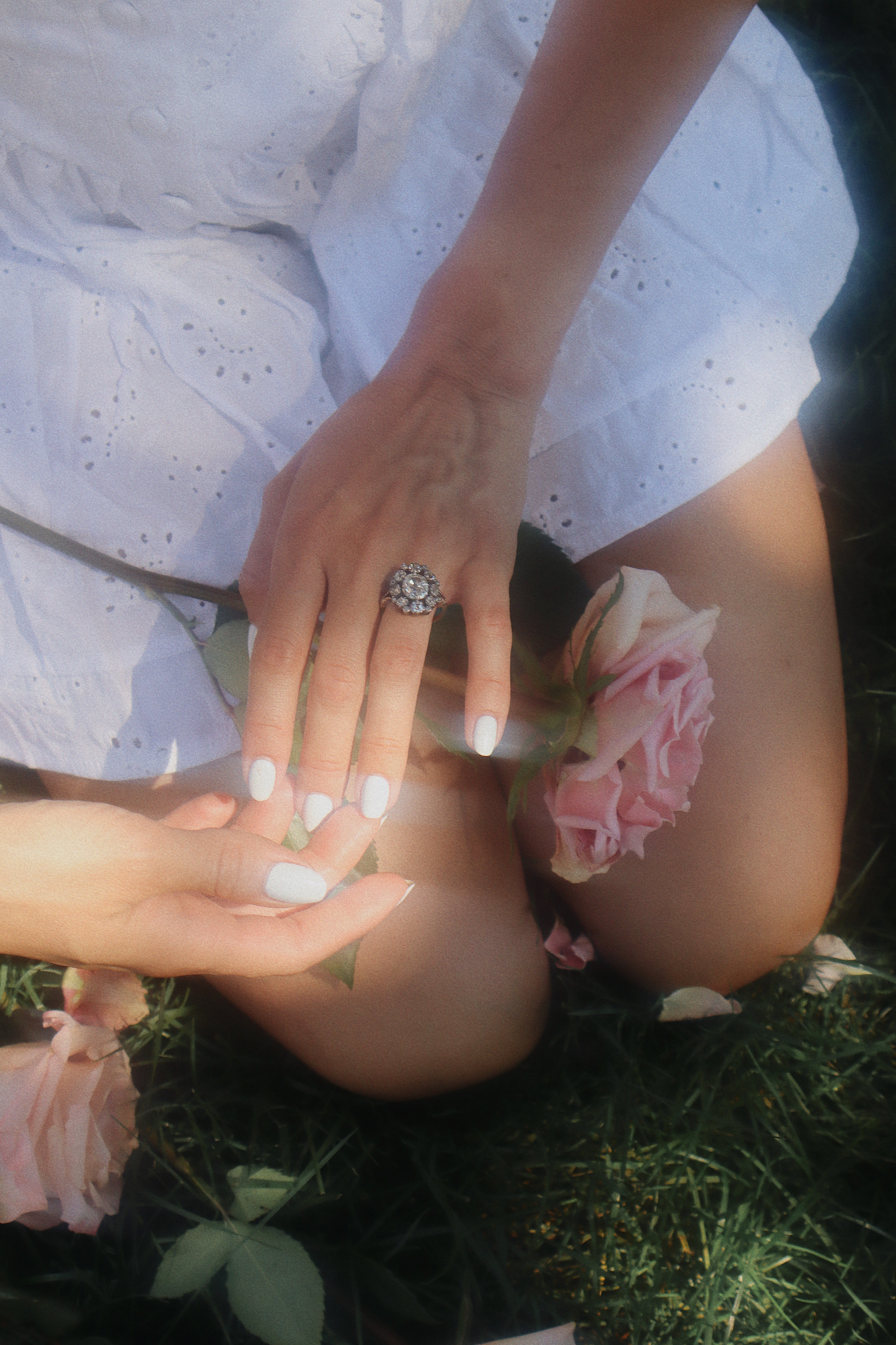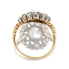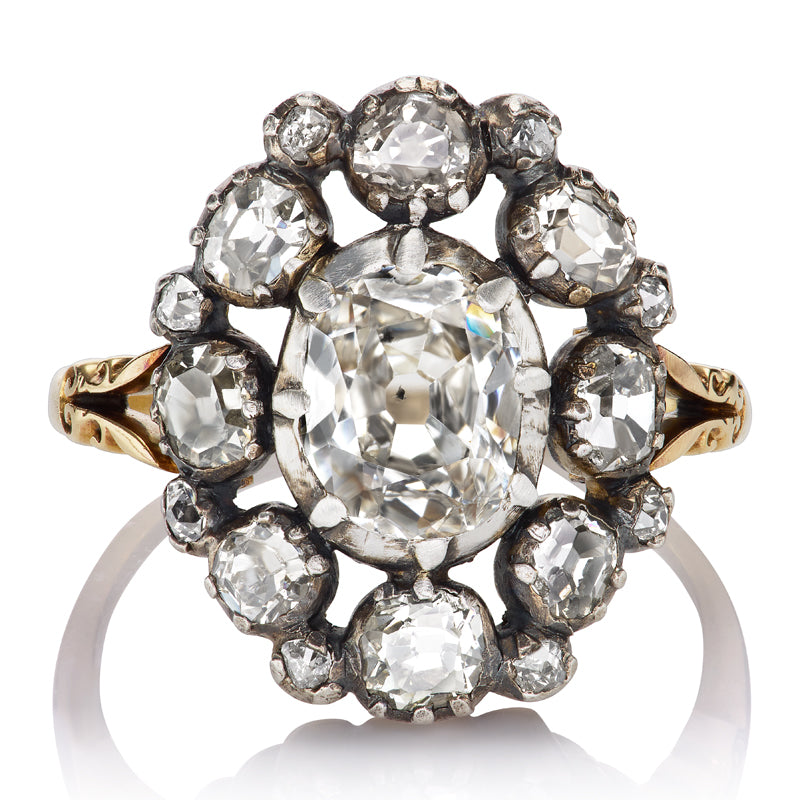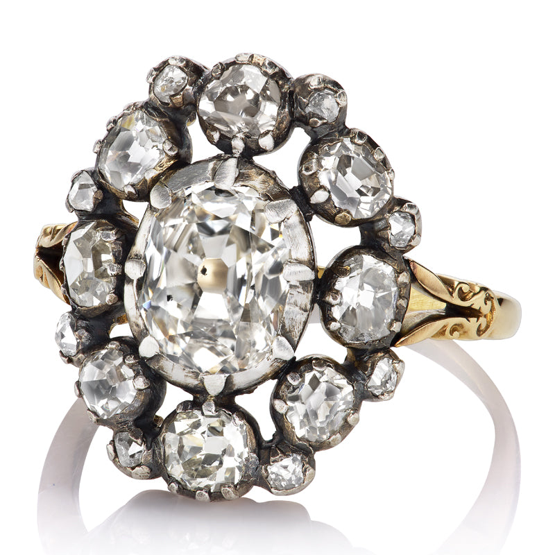 The Domenica ring is an authentic antique ring from the late Georgian period circa 1830. The ring centers an approximately 1.70 carat Old Mine Cut diamond of H-I color, I1 clarity. Surrounding the center stone is a unique halo of 16 Old Mine Cut diamonds of similar color and clarity, which combine for approximately 1.70 carats.
