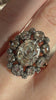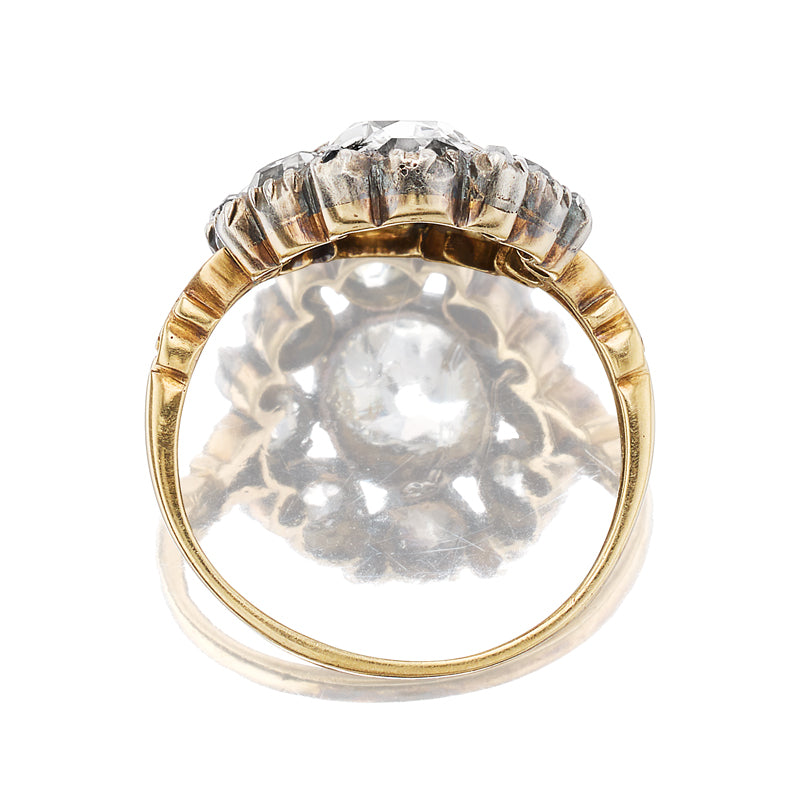 An incredible example of a historic Georgian ring! Featuring a sizeable, bright, elongated Old Mine Cut diamond with a cluster of additional chunky diamonds, this ring is an old-world beauty. We love the natural patina on the collet silver settings and the nuanced gold band. Truly a one-of-a-kind piece with impeccable finger coverage, a low wearable profile, and a ton of dramatic flair.