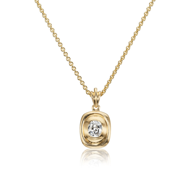 The June Pendant is an AB original design. The pendant centers a GIA-certified 1.04-carat Old Mine Cut diamond of M color, SI2 clarity. The stone is set flush in an 18 karat Yellow Gold sculpted setting. The pendant comes on our Classic 18-inch 18kt Yellow Gold chain.