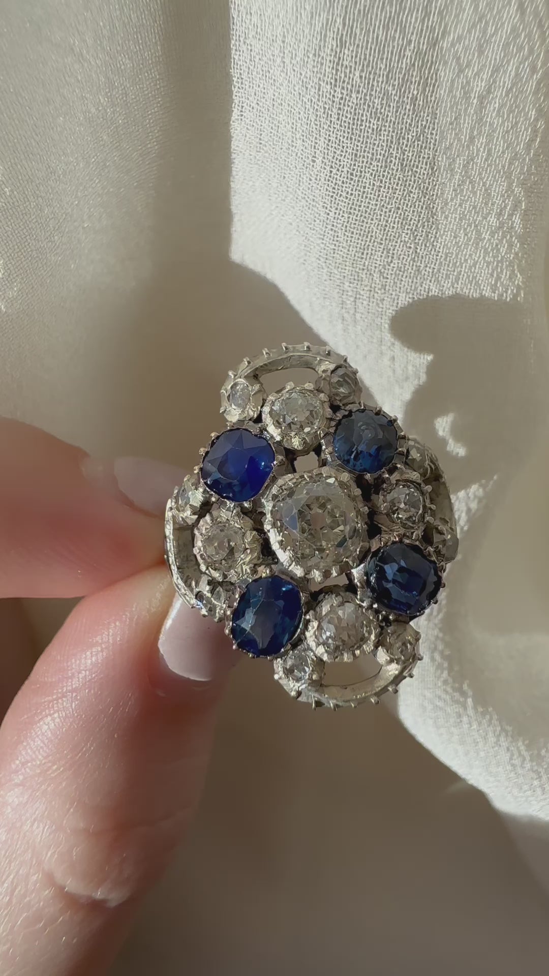 Winifred is a rare Georgian-era cluster ring. She features 5 quintessential chunky antique diamonds accented by 4 bright blue sapphires that bring a lot of depth to this stunning piece. This is the perfect ring for someone looking for a unique piece that makes a statement. 200+ year old rings should be worn with care.