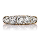 The Canterbury ring is an authentic antique diamond ring from the Edwardian Era circa 1910. The ring features five Old Mine Cut diamonds of K-L-M-N color, SI-I clarity. These stones combine for an approximate total of 1.50 carats. The stone is set in a 14kt Yellow Gold half hoop setting with the cutest heart-themed details. The ring is currently size 5.5 and can be resized!