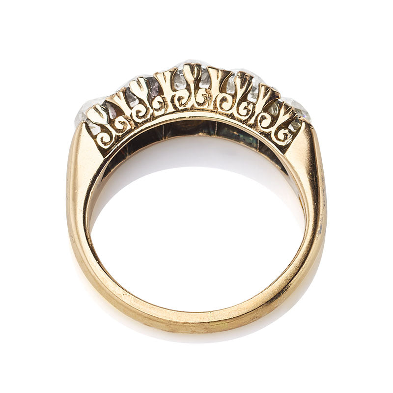 An antique half hoop is always a favorite, and this beauty is no exception. Full of sparkling diamonds, chunky gold, and charming engravings, she’s the perfect piece to stack on any finger.