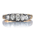 The Myron ring is an authentic antique diamond ring from the Victorian Era circa 1830. The ring features five Old Mine Cut diamonds set in a silver-topped 14kt yellow gold setting. The diamonds combine for approximately 1 carat of J-K color, SI-I clarity. The ring is currently size 8.75 and can be resized!