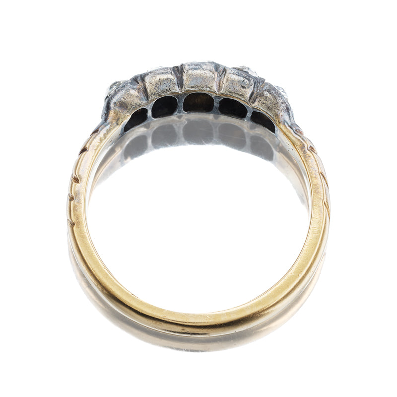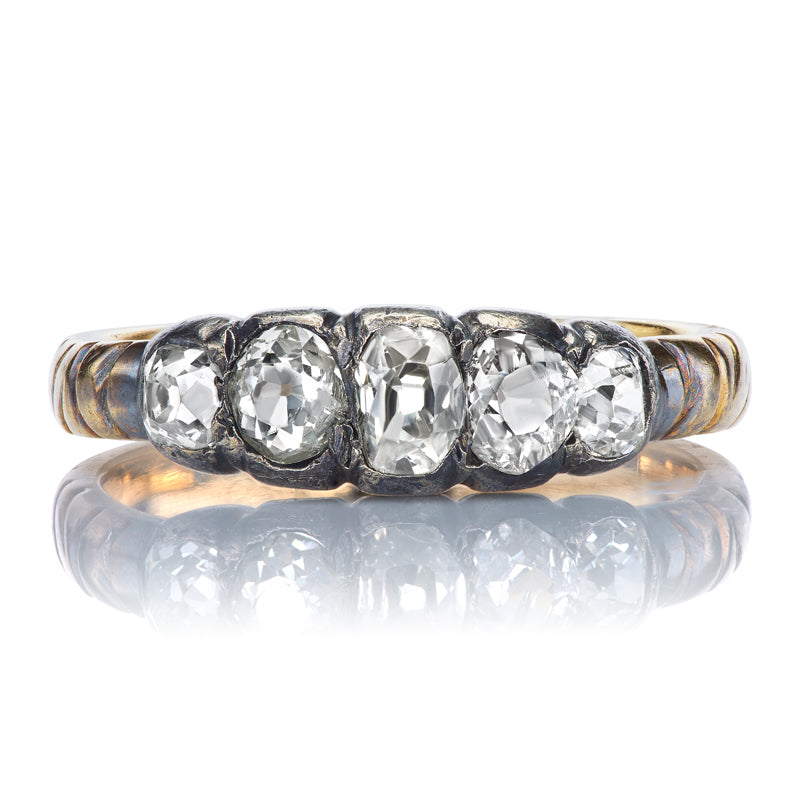 Veiled, smoky romance comes off this Early Victorian period half hoop. Myron's patinaed collet setting cradles five hand-cut Old Mine Cut stones. We love how each diamond has its own character and chunky faceting! Myron's carved gold band provides an interesting contrast to the silver setting surrounding the stones. Stunning alone or worn as a wedding band, Myron is a special historical ring.