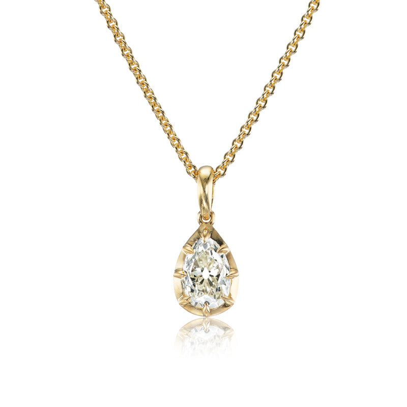 The Lulu Pendant 2.43 is an AB original made right here in NYC. The pendant features a GIA Certified 2.43 carat Pear Cut diamond of M color, VS1 clarity. The diamond is collet-set in an 18kt Yellow Gold setting with an 18kt gold bail. The Pendant comes on our 18 inch 18kt yellow gold chain.
