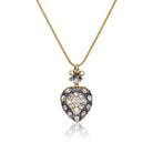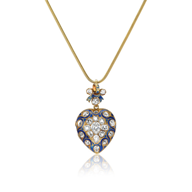 The Delia Pendant is an authentic antique heart locket from the Victorian Era circa 1850. The pendant features an approximately 0.50 carat Old Cut pear diamond of approximately I-J color, SI clarity. The stone is set in a 18kt Yellow Gold heart locket surrounded by a starbust of eight additional Old Mine Cut and Pear Cut diamonds. Twelve additional diamonds frame the center cluster in a ribbon of blue enamel, topping the piece with a bow. The pendant opens on a hinge, allowing for a momento or photo to be displayed and is backed in clear rock crystal.